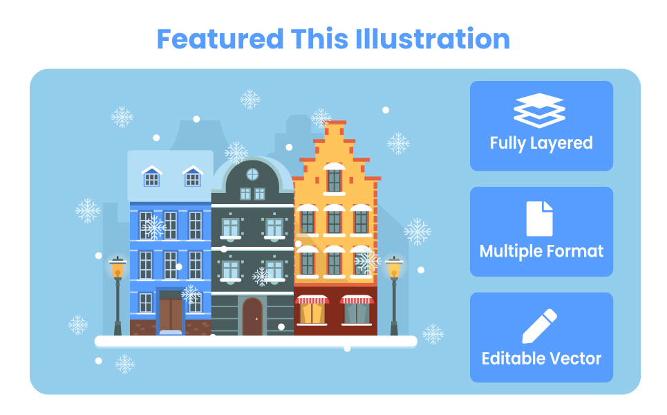Winter City Street Flat Vector Illustration showcases colorful European-style buildings blanketed in snow. This delightful winter scene is ideal for seasonal designs, holiday websites, Christmas and New Year banners, greeting cards, mobile apps, presentations, and marketing materials. Created in a clean, flat style with soft colors and detailed snowfall, this illustration adds a warm and festive atmosphere to any winter-themed project.