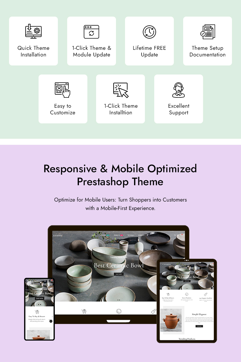 Using Ceramic is simple and flexible. After installing the theme on your PrestaShop store, you can easily customize colors, fonts, layouts, and banners using PrestaShop’s built-in theme settings—no coding knowledge required. You can upload high-quality product images, add detailed descriptions, and organize your products into clear categories for a smooth customer journey. The theme is optimized for performance, SEO-friendly structure, and fast loading, helping improve visibility and conversions.