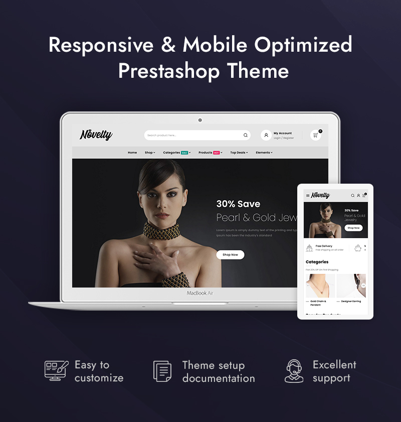 Novelty is a luxurious, elegant, and visually captivating Best PrestaShop Themes designed for jewelry stores, accessory boutiques, and premium fashion brands. With its clean layout, refined typography, and high-end design aesthetics, Novelty creates a sophisticated shopping experience that beautifully highlights rings, necklaces, bracelets, earrings, and exclusive jewelry collections.