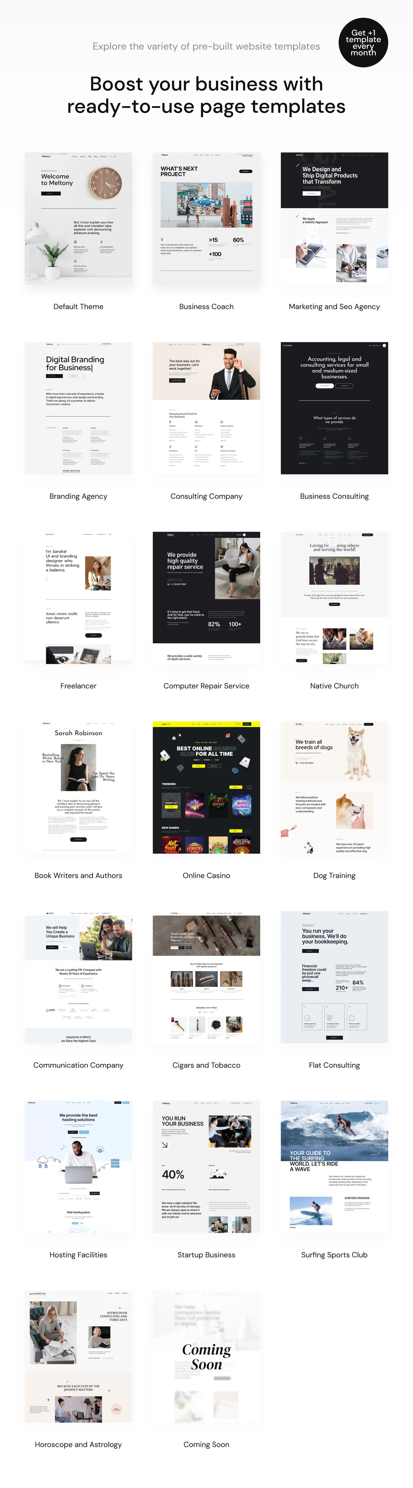 Thanks to its versatility, Meltony adapts effortlessly to a wide range of industries. It’s an excellent solution for Business Coaches, Consulting Agencies, Marketing and SEO Agencies, Branding Agencies, Startup Business Companies, and Freelancers who want to present services professionally. The theme also works well for Computer Repair Services, Communication Companies, WHMCS & Hosting providers, and Flat Consulting firms that require clear structure and credibility.